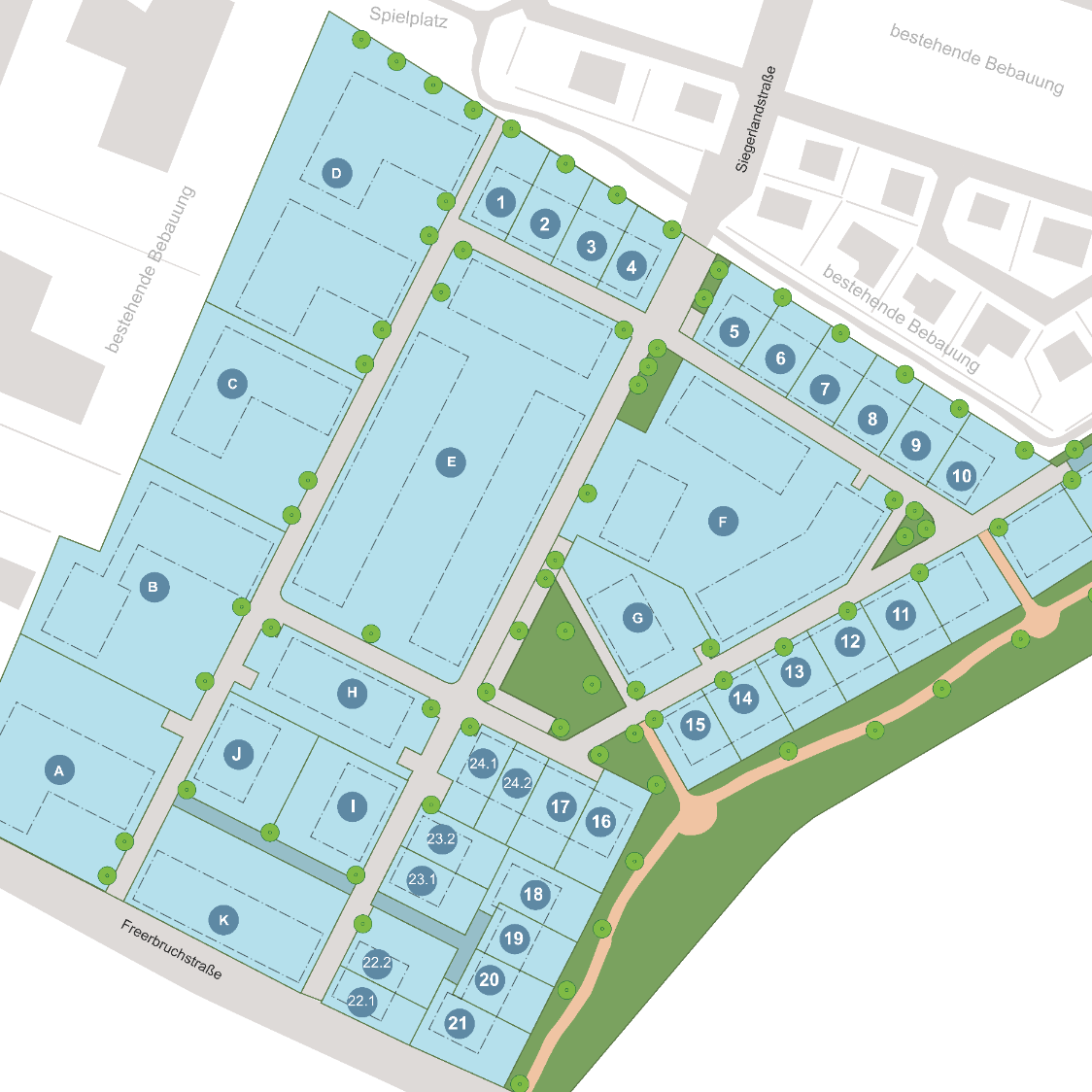 Neben 21 exklusiven Baugrundstücken für freistehende Einfamilienhäuser entstehen weitere Grundstücke für Doppel- und Reihenhäuser sowie fünf Bauplätze für Mehrfamilienhäuser - ideal für Investoren oder generationenübergreifendes Wohnen.